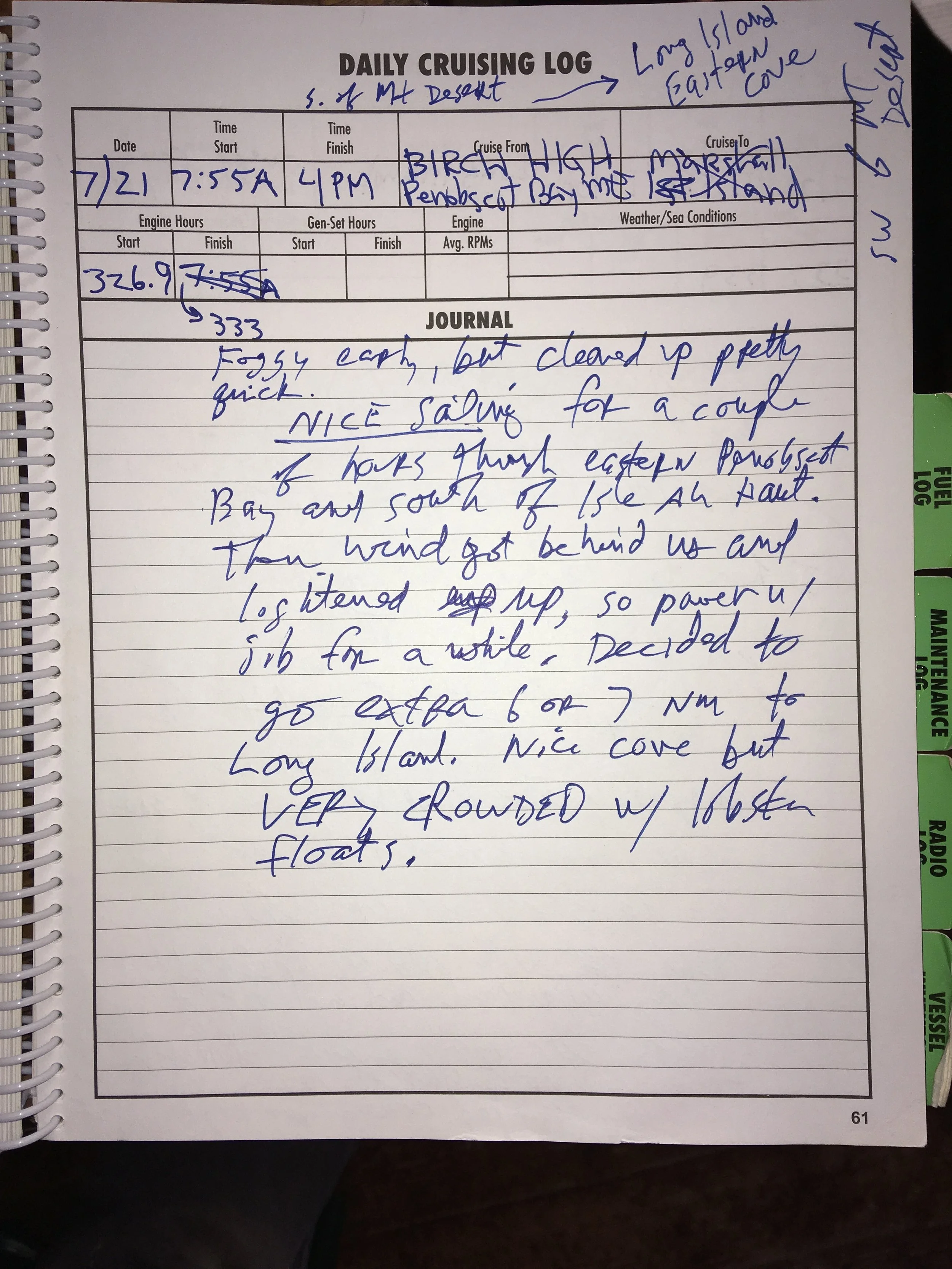 Anchored in Eastern Cove, Long Island ME. Another nice anchorage but for the hundreds of lobster trap floats.