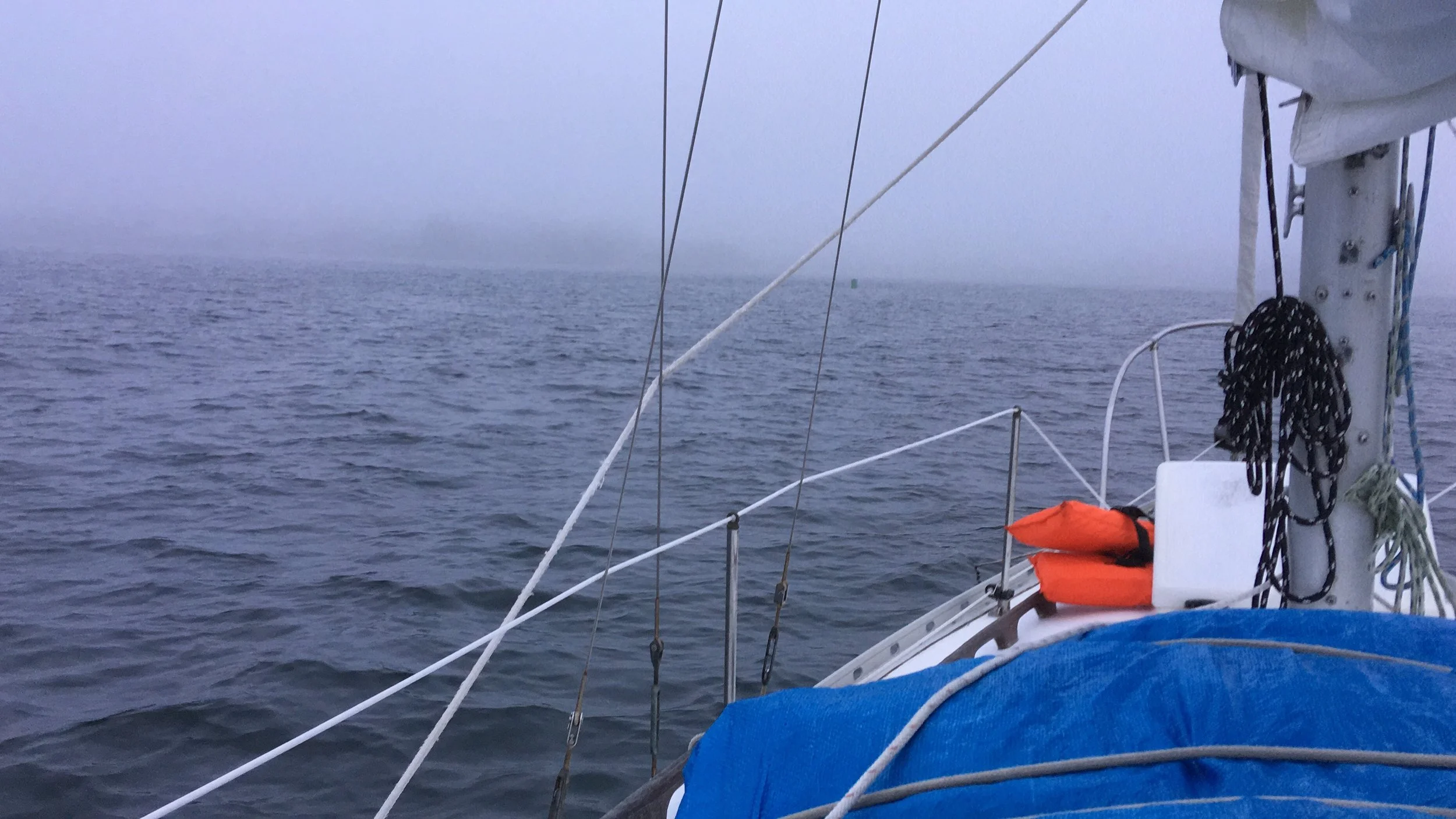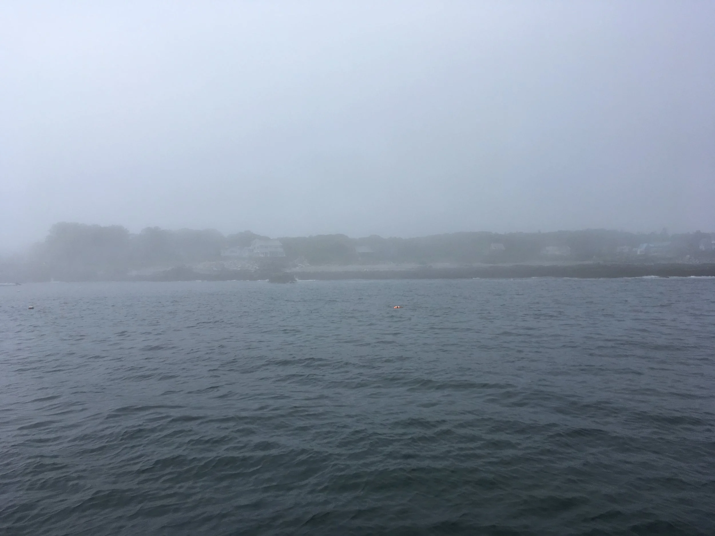 It opened up some by 7:30am. I waited around for another couple hours and decided to venture on. It was okay at first, then visibility really closed in. There were a number of navigation buoys out around Cape ELIZABETH, and I proceeded cautiously from one to the next. I was pleased and relieved that I was able to do this. Seeing the buoy in real life just as I saw the boat come up to it on the chartplotter emboldened me to keep going. I figured I’d crawl around Cape Elizabeth and follow the shore till I found some reasonable place to anchor. It’s hard to estimate how much visibility I had, and it varied, but maybe ranged from 75 feet to a couple hundred feet.