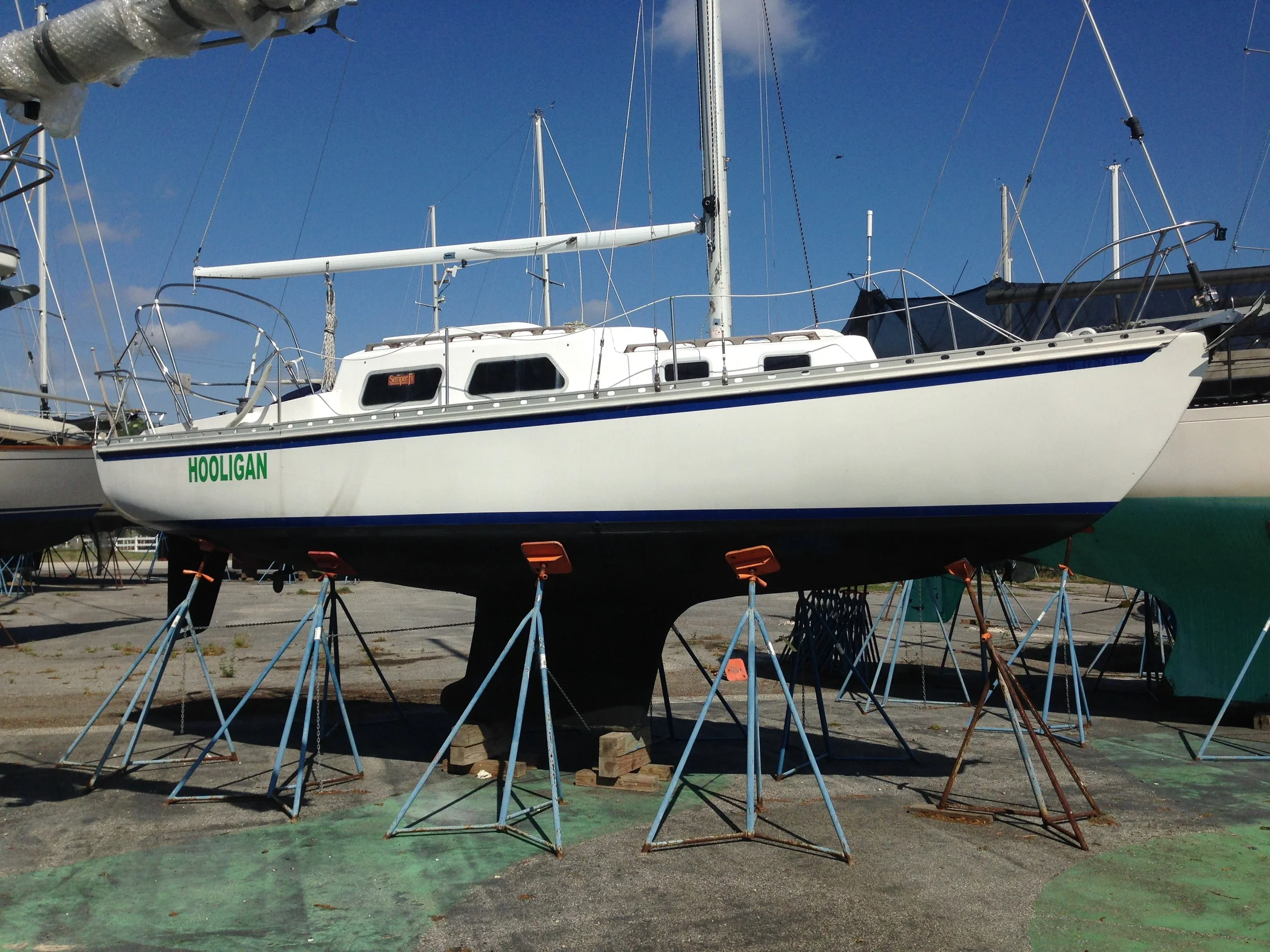 So I spent the summer in Maine and Massachusetts, and drove back to Florida at the end of September 2016. On the way I stopped in Annapolis to visit a friend from the marina and bought a boat from him. He had rescued a Cascade 29 from the Annapolis area the year before. He had a friend help him re-power the boat with a Yanmar 3GM30 engine. This engine had been manufactured about 15 years before, but my friend bought it from someone who got it for a project that never came to fruition. It was still in the Yanmar packing crate. He took the boat to Florida and it was stored on the hard at Green Cove Springs Marina, on the St John River about 20 miles upstream from Jacksonville. Here she is the first time I saw her.